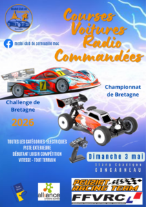 Le Model CLub de Cornouaille organise le vendredi 3 mai une course de voitures radio commandées sur le complexe de stang Coadigou à Concarneau.Cette course est entièrement électrique.Au programme : une manche du championnat de Bretagne (Piste 1/10 - 1/8, GT8 Open - TT 1/8 open promo)une manche du challenge…